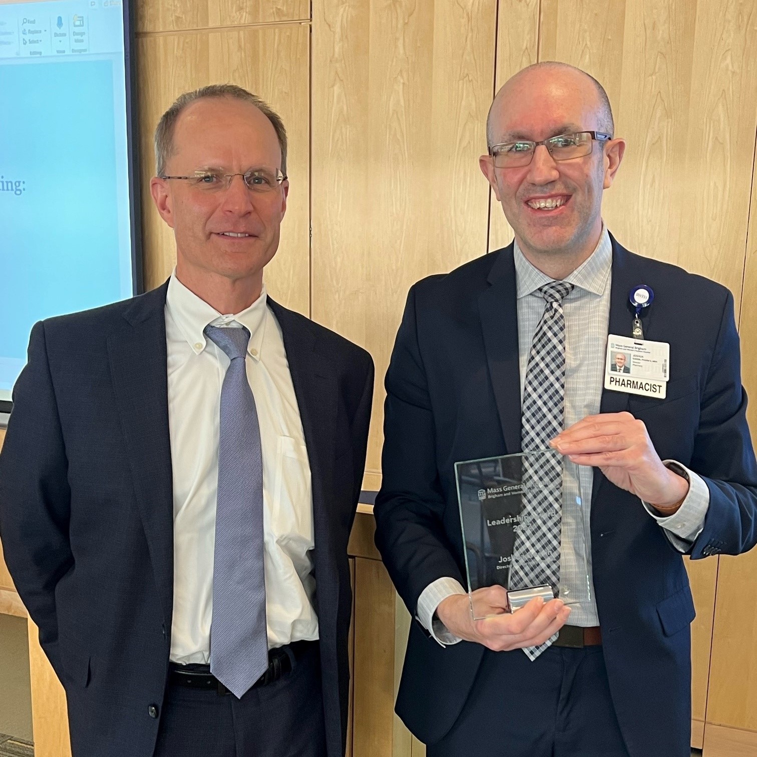 Brigham and Women’s Faulkner Hospital’s Leadership Award was established in 2005 to recognize and honor a member of the leadership team for their outstanding contributions to both their department and to the hospital at large. The award is presented annually to a member of the Brigham and Women’s Faulkner Hospital Leadership Council who demonstrates outstanding leadership, fosters creativity and supports innovation in all they do. At a recent Leadership Council meeting, Director of Pharmacy Services Joshua Guerin, PharmD, MBA, was presented with the 2022 Leadership Award.