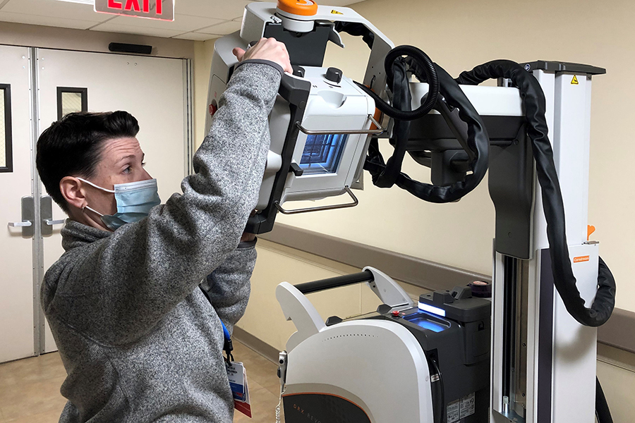 Diagnostic Radiology Supervisor Michelle Williamson, RT(R), demonstrates the Carestream DRX-Revolution Mobile X-Ray System