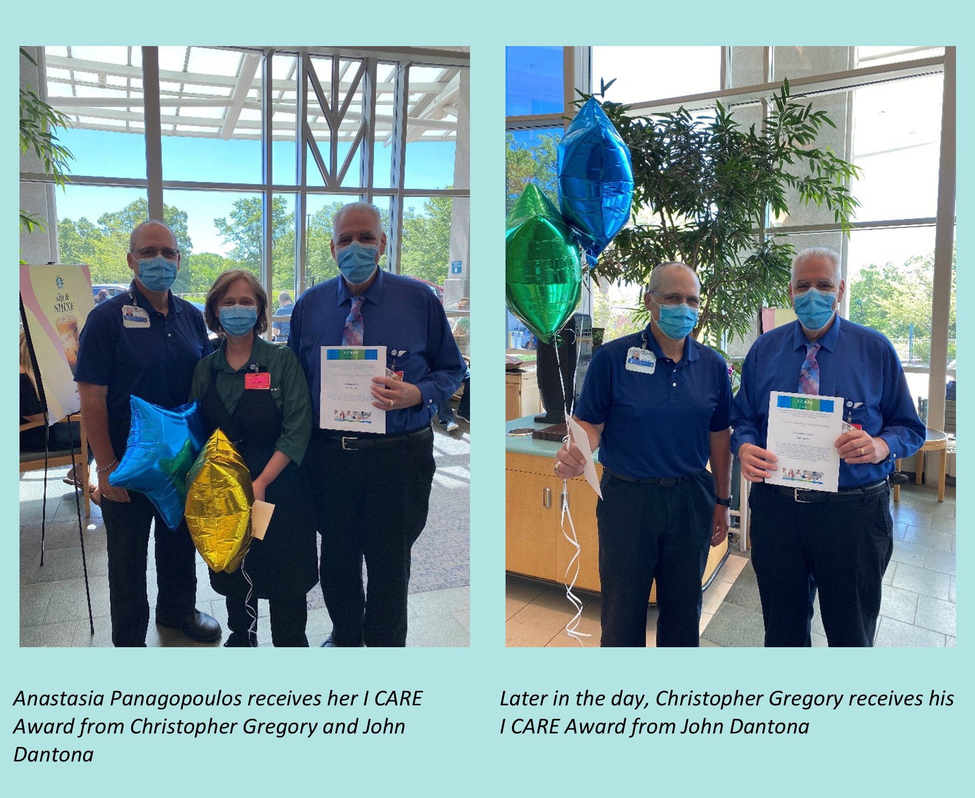 Brigham and Women’s Faulkner Hospital’s I CARE Award recognizes staff members from all areas of the hospital who go above and beyond their regular job responsibilities to make BWFH a great place to work and receive care. Atrium Café barista Anastasia Panagopoulos and Supervisor Christopher Gregory were recent recipients of I CARE Awards.