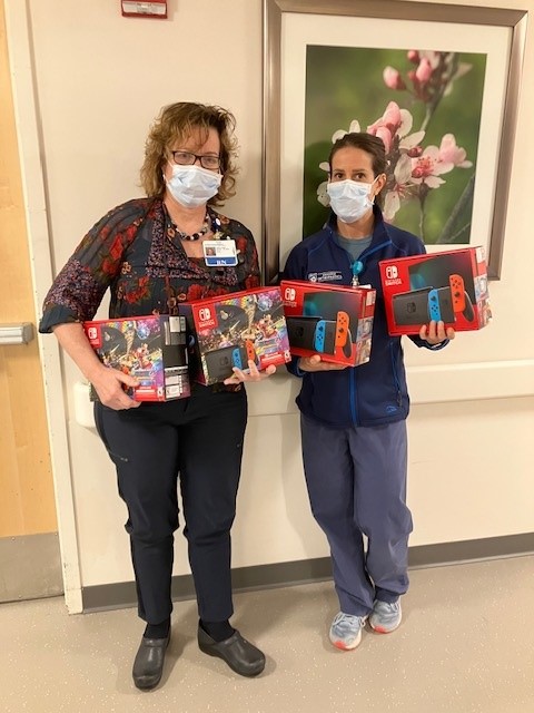 7 South Nurse Director Mary Anne Barry, MBA, BSN, RN, and APP Council Chair Laurie Rieger, MSN, RN, AGPCNP-BC, display gifts collected for the kids at the Italian Home for Children