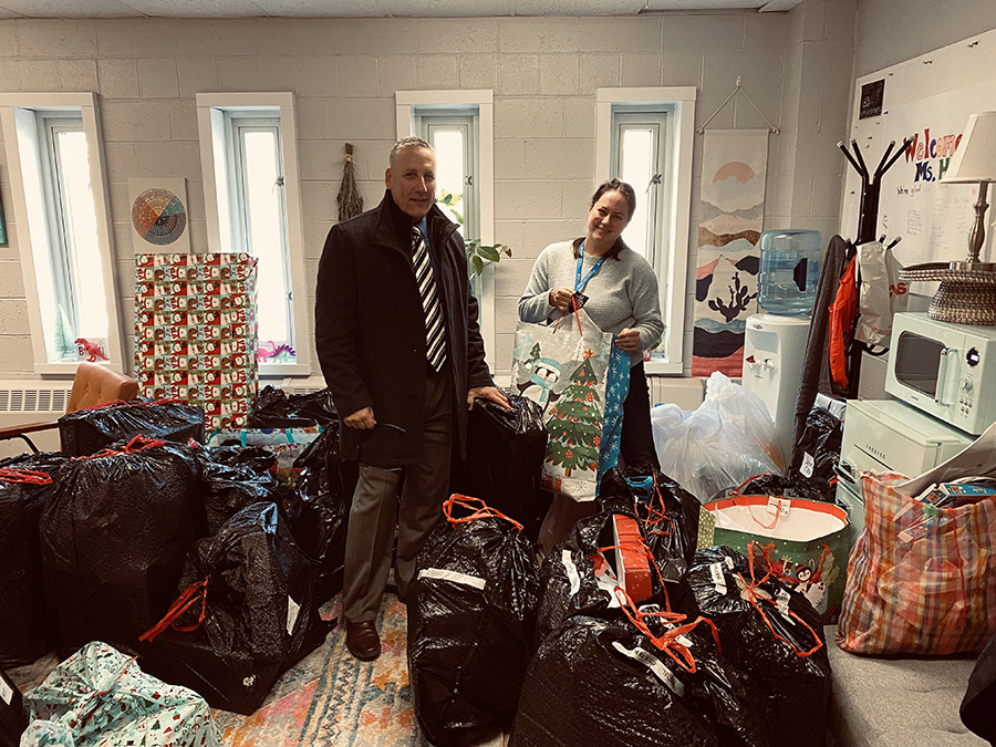 Community Health and Wellness Program Manager Katie Plante (right) gets help from BWFH’s Security Operations Manager and Chief of Police Paul Baker delivering gifts to the JP Manning Elementary School