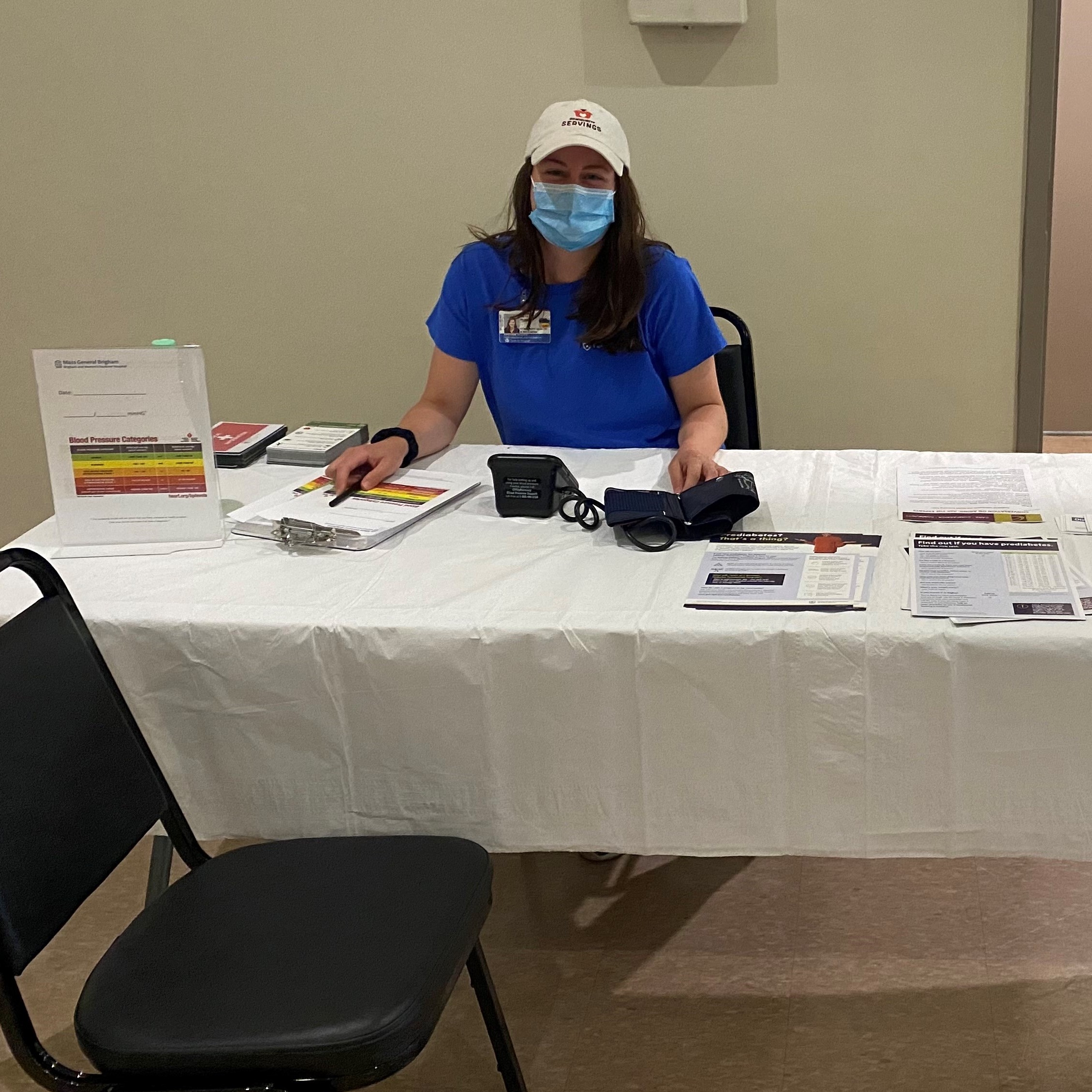 Community Health Program Manager Katie Plante offers blood pressure screenings at Ethos’ Conversation on Aging: Ask the Experts event in West Roxbury