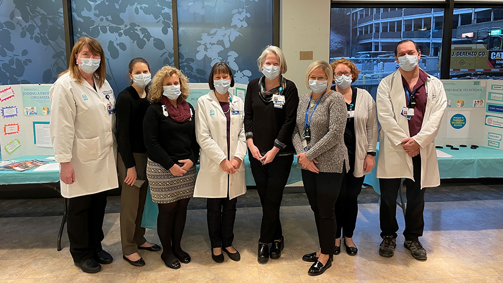 The Professional Development Fair was hosted by BWFH’s Nursing Professional Development team; From Left: Professional Development Manager for Recruitment and Retention Ann Marie Reynolds-Lynch, DNP, MSN, RN, Program Manager for Nursing Quality and Magnet Rose LaPlante, MBA, MSN, RN, NEA-BC, Professional Development Manager for the Emergency Department and Nursing Supervisors Beth Waters, MSN, RN, CPEN, Professional Development Manager for the PACU, 7 South, Center for Preoperative Evaluation and Pre-Op Holding Kathy McCarraher, MHA, BSN, RN, CPAN, ONC, Professional Development Manager for 6 North and 7 North Susan Belton, MSN, BS, RN, CNL, Professional Development Manager for Nursing Orientation and Transition to Practice Jennifer Capone, MSN, RN, Nursing Professional Development Operations Coordinator Shania Estime and Professional Development Manager for 6 South, IV and the Float Pool Phil Malleson, MSN, RN, NPD-BC