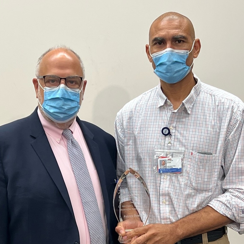 The Dr. Norman L. Sadowsky Award for Excellence goes to an individual who best exemplifies the qualities Dr. Sadowsky himself demonstrated throughout his illustrious career. This year’s recipient, announced recently during Daily Safety Huddle, is Shift Lead for Desktop Support Services Patrick Dyer.