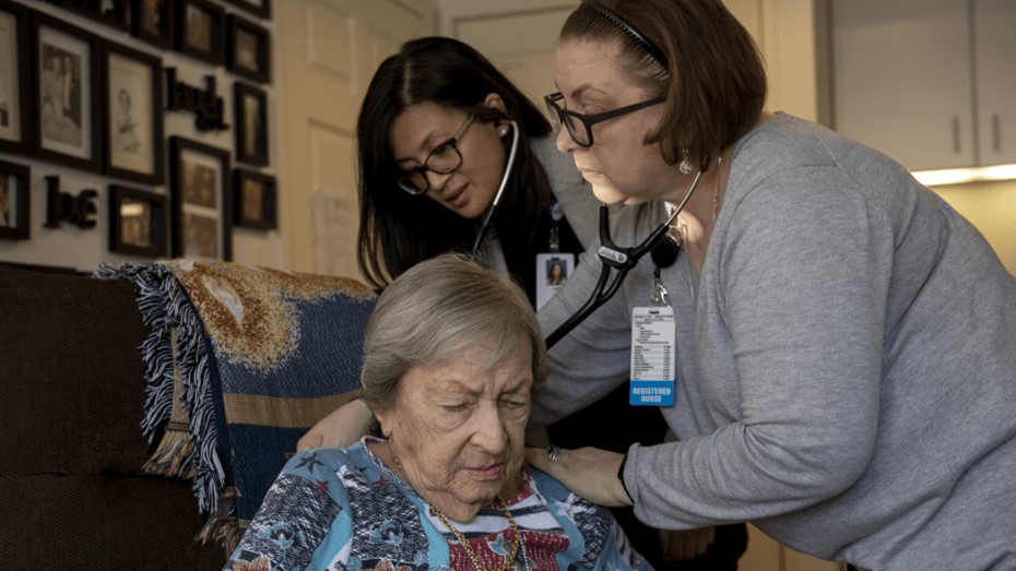 Home Hospital team members Helen Le, PA-C (left) and Amy Costa, RN (right) checking on a patient at home