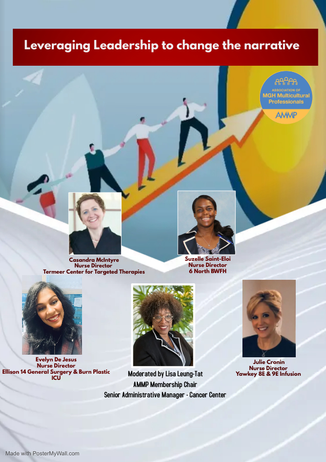 The virtual event featured several nurse directors from MGH in addition to Saint-Eloi and was moderated by AMMP Membership Chair Lisa Leung-Tat. The goal of the discussion was to explore the definition of “narrative,” how it’s changed over the last two years in light of the COVID-19 pandemic, the fight against systemic racism and the divides in which we currently live and how we can leverage leadership to change the narrative.
