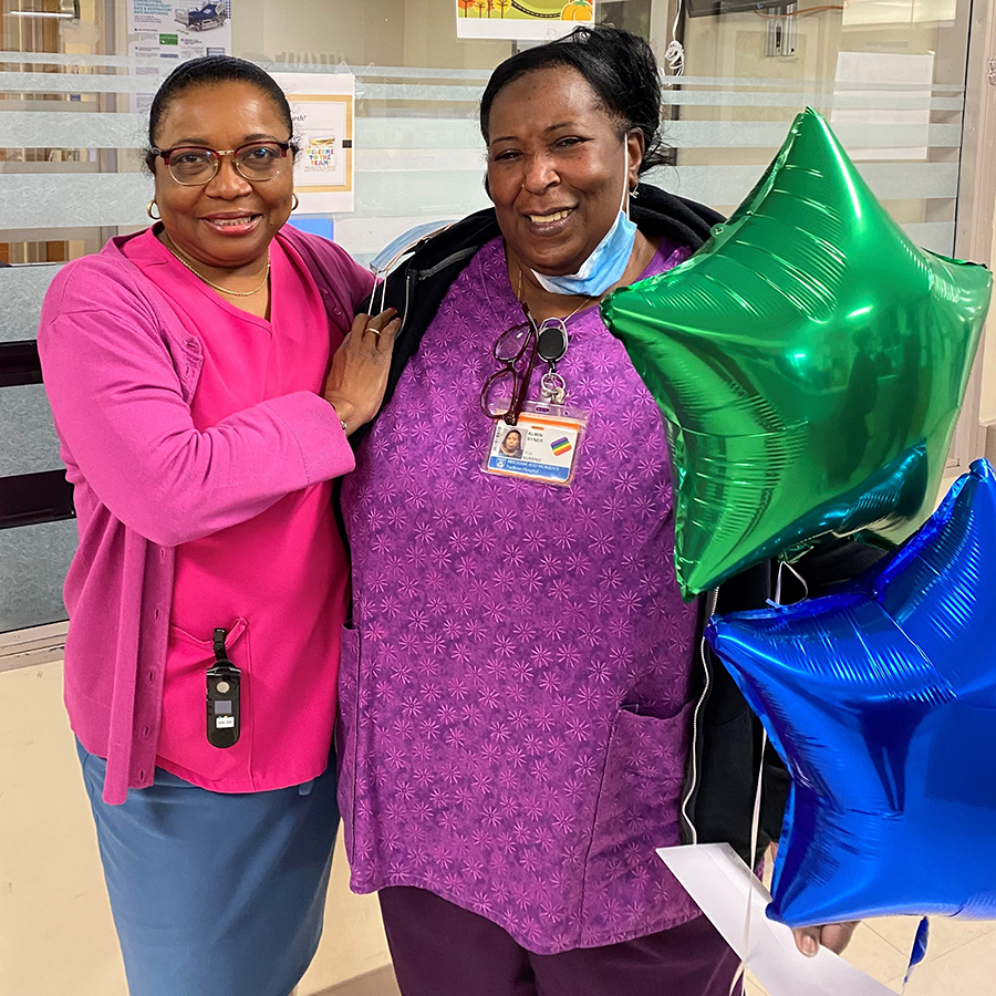 Almin Ryner (right) receives her I CARE Award from 6 North staff nurse Ninon Bastien, BSN, RN (left)