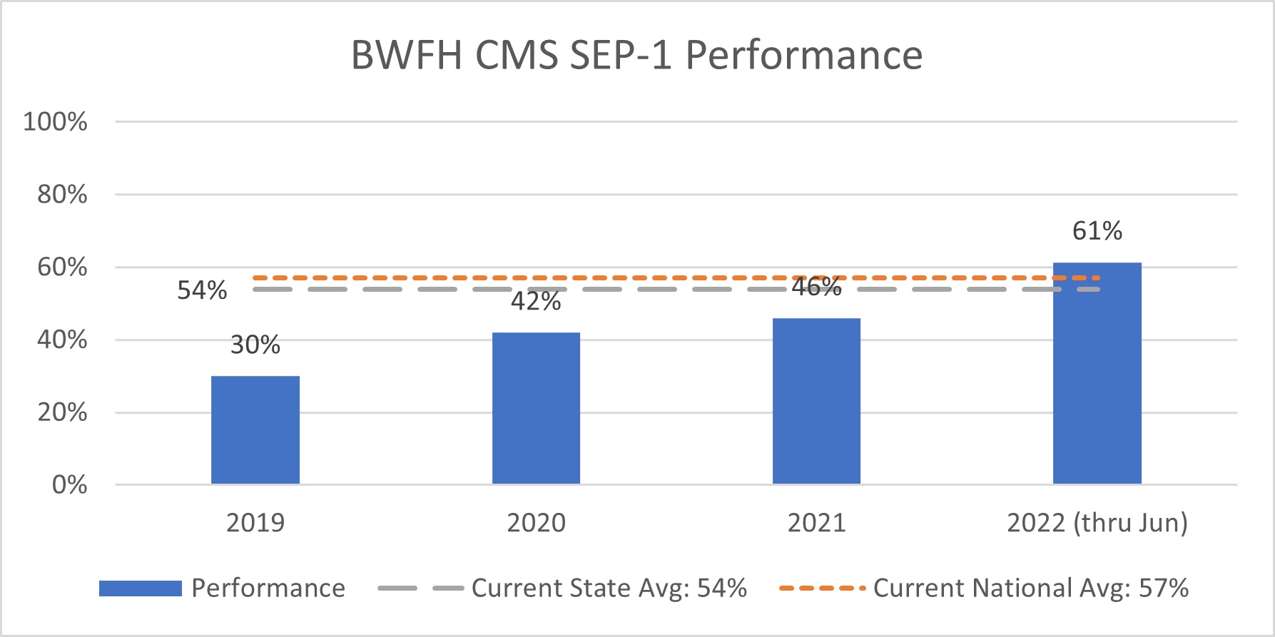 “Focusing on our CMS SEP-1 performance, you can see from the chart below that the workgroup has played a major role in our improvement. We had a performance rate of 37 percent in 2019-2020 when the workgroup was on hiatus due to the COVID-19 pandemic. The workgroup reorganized in 2021 and we have had a performance rate of 52 percent since then—a 15 percent increase!” says O’Loughlin.